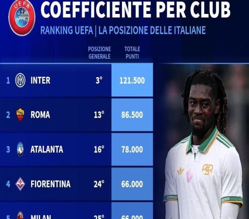 意甲俱乐部欧战积分排名:国米断档第1,米兰第5,尤文第6 -